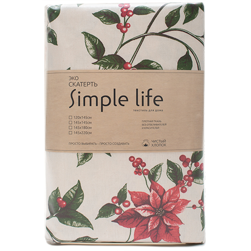 Скатерть "Simple life" 145х220 из саржи плотностью 165 гр./кв.м. Практична и проста в уходе. Саржа обладает высокой впитываемостью и износоустойчивостью. Скатерть обрабатывается швом в подгибку, с закрытым срезом 1,5 см, с евроуголками, нитки в цвет ткани. Пошив в строгом соответствии с ГОСТ. Современный тренд в дизайне - экологичность и натуральность окружающих нас предметов. Дизайн "Пуансеттия" входит в постоянную коллекцию "Simple life".